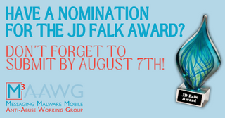 The Messaging Malware Mobile Anti-Abuse Working Group (M3AAWG) is calling on members of the anti-abuse community – inside and outside of M3AAWG – to submit nominations for the J.D. Falk Award. The award will be presented at the 59th General Meeting, October 9-12, 2023, in Brooklyn, N.Y.