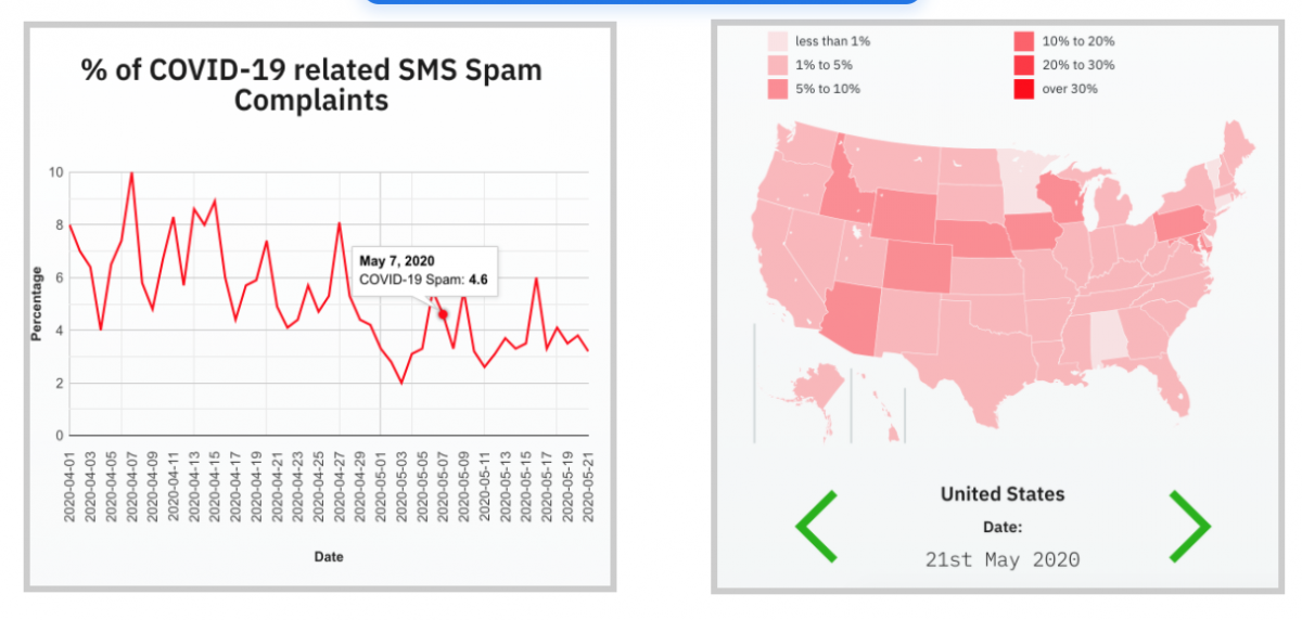 It illustrates the percentage of SMS spam complaints that are COVID-19 related across each day, beginning April 1, 2020. Additional graphs show the concentration of these SMS spam complaints across each U.S. state and Canadian province. The complete data set is updated daily with new percentages of complaints.