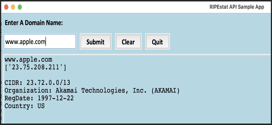 That's NOT a very sophisticated application -- intentionally so! It was meant to be a simple introduction to building SOME SORT of code of your own that accesses an API, in this case, the RIPEstat API. Think of this as a "Hello, World!" of sample API applications, just retrieving and displaying four bits of information (out of a LARGE number of potentially interesting bits), BUT if you can do it for even four chunks of information, you could do it for a far larger and more sophisticated set of information from that API, too.